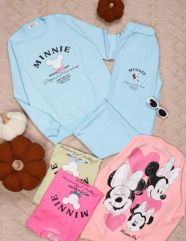بلوز شلوار ست دخترانه آستین بلند گلدوزی میکی موس و قلب دخترانه با رنگ های: صورتی کم رنگ، صورتی پر رنگ، آبی آسمانی، سبز فسفری